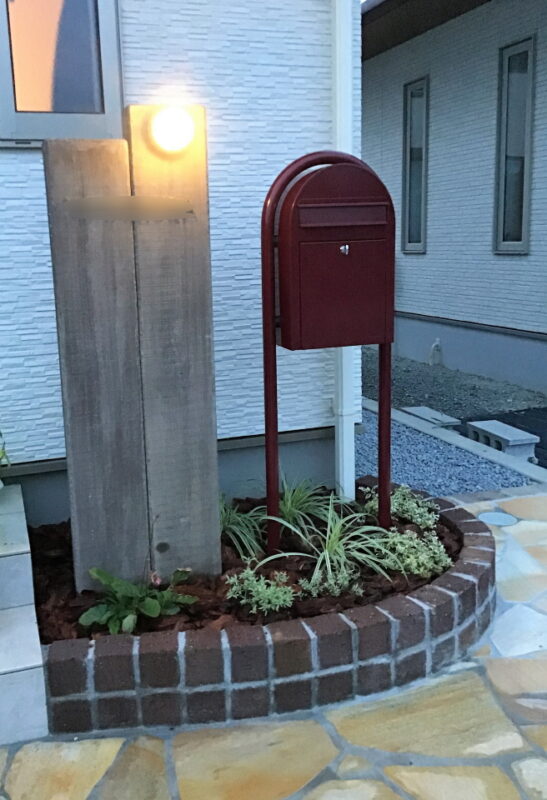 コンクリート枕木&レンガでナチュラルなデザインになるよう工夫しました。ワインレッドのBOBIポストがアクセントになっています。