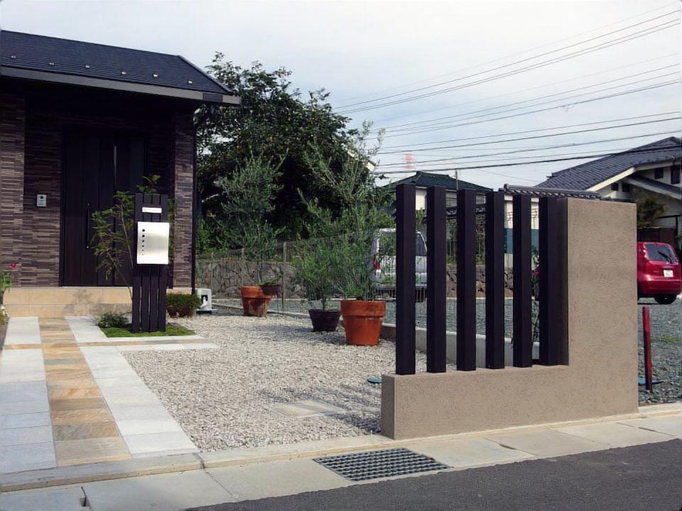 すっきりとしたオープンタイプの門周りです。門柱はアルミ角柱にポストと表札を設置し、すっきりとしたデザインになっています。道路側にも塗り壁+角柱を立て、門柱との統一感をもたせています。
