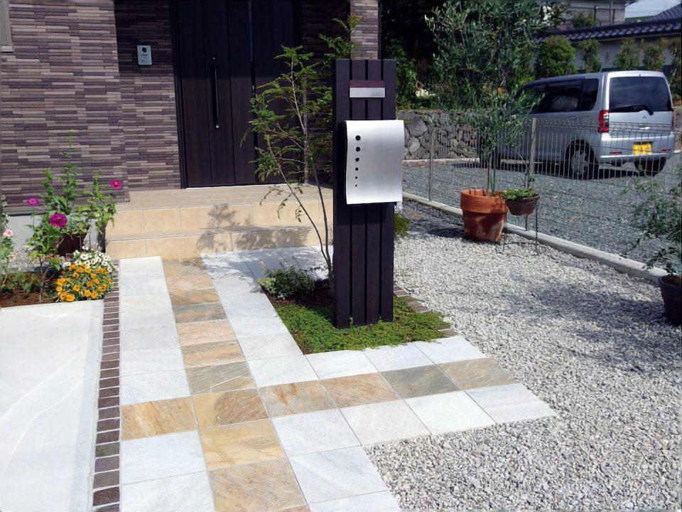 アプローチは異なった色の自然石平板を設置しました。