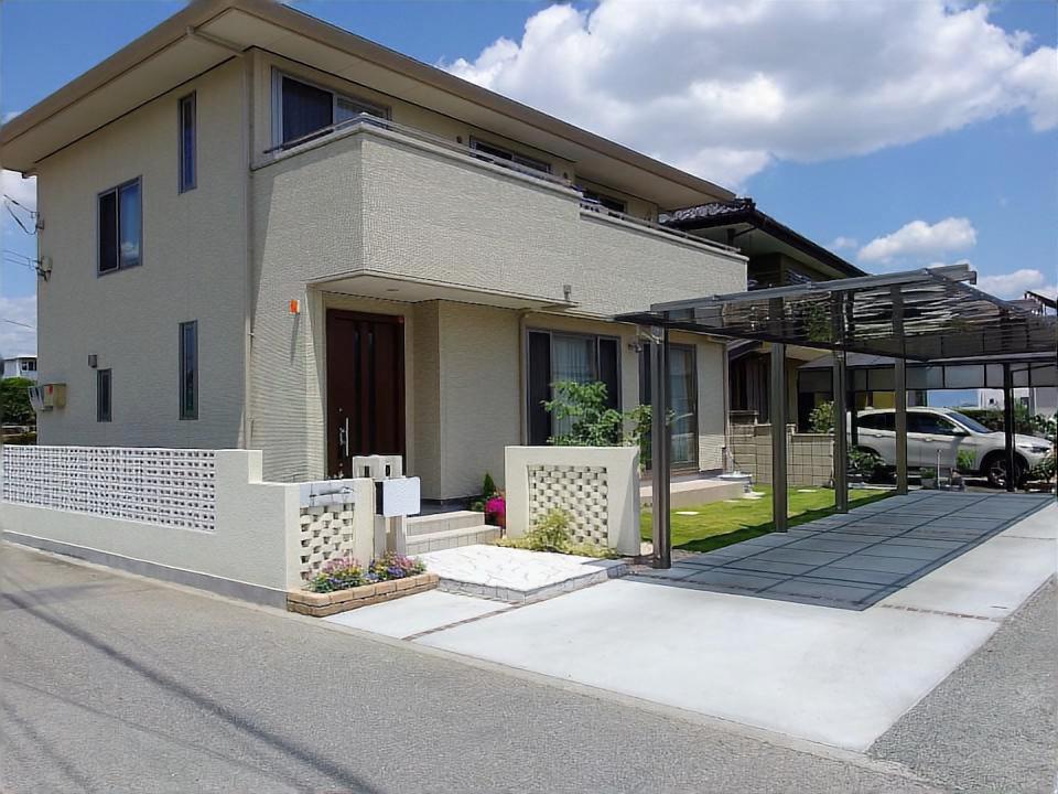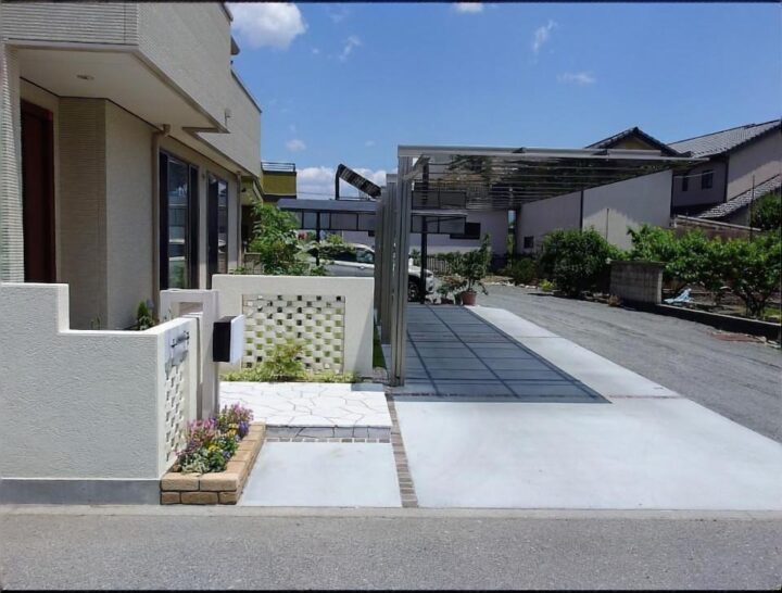 全体的な写真です。縦列式のカーポートも取り入れました。