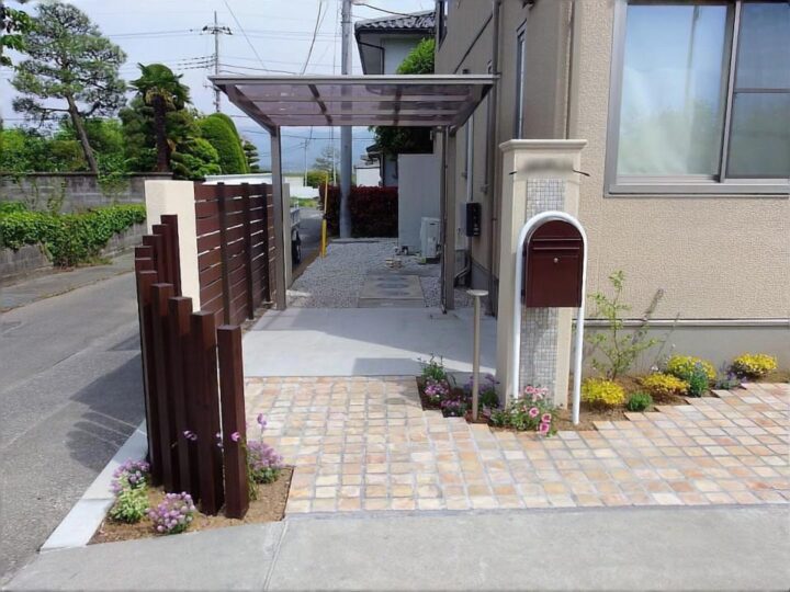 木彫系の角柱を曲線を描くように設置しました。アプローチはピンコロ石の石畳です。