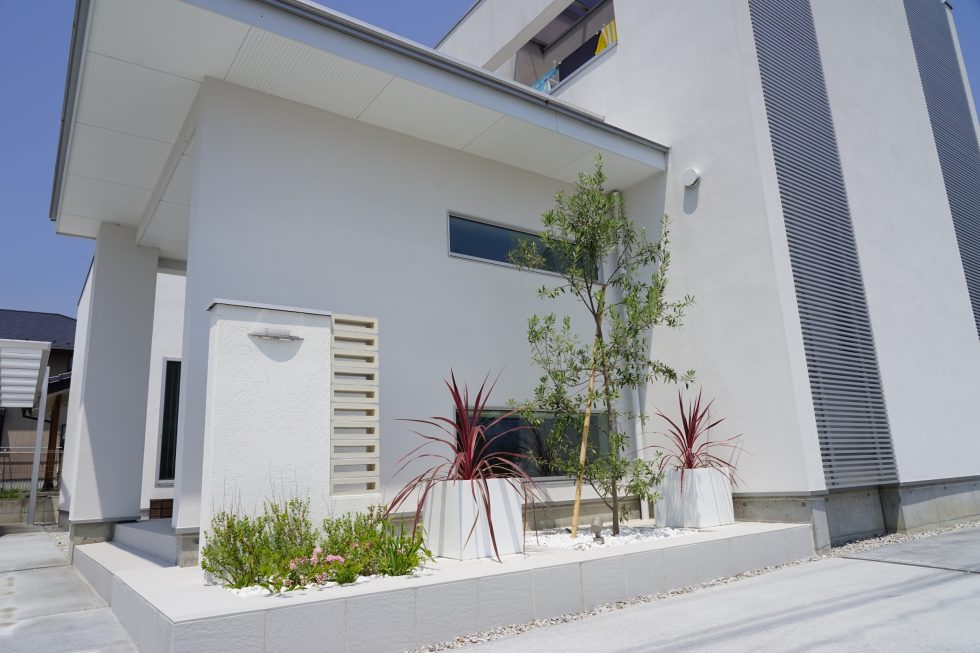 建物のお色が白で統一されていたため、門周りも白ベースのファサードを心掛けました。門柱には空洞ブロックを一部取り入れアクセントを加えています。