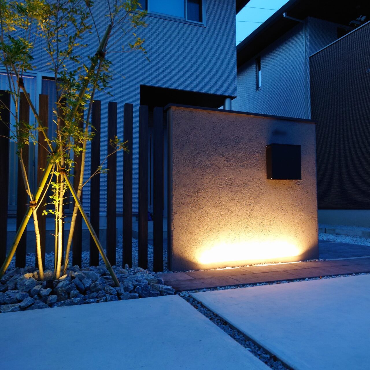 塗り壁門塀下にはバーライトを配置しました。夜のライトアップでより高級感のある雰囲気になりました。