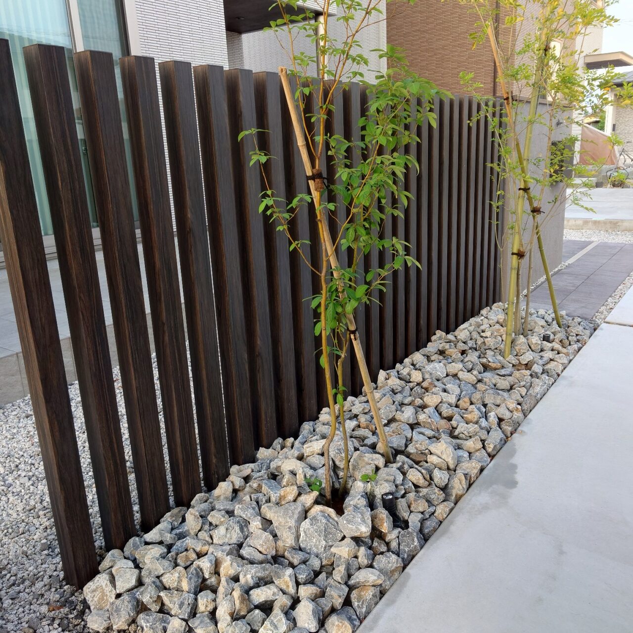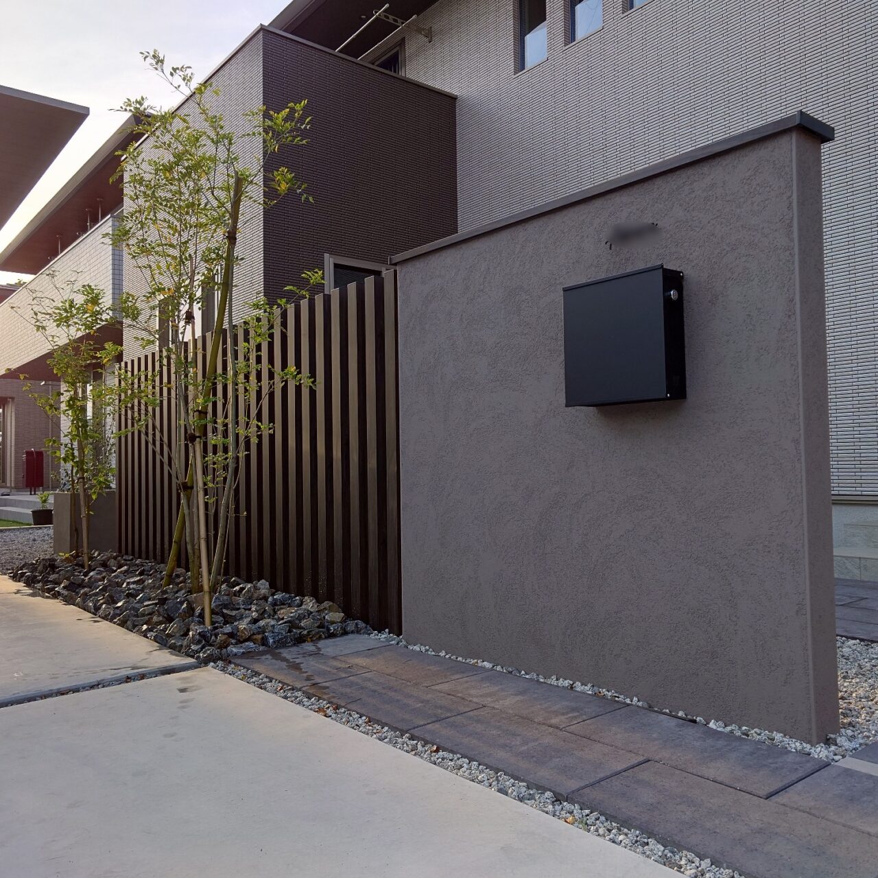 今回、門周りは塗り壁+ブラック色の角柱を採用しました。塗り壁の色は建物外壁の色と調和するようグレーを帯びたブラウン系の色合いに致しました。角柱前には植栽&自然石を配置し、自然な風合いになるよう考えました。