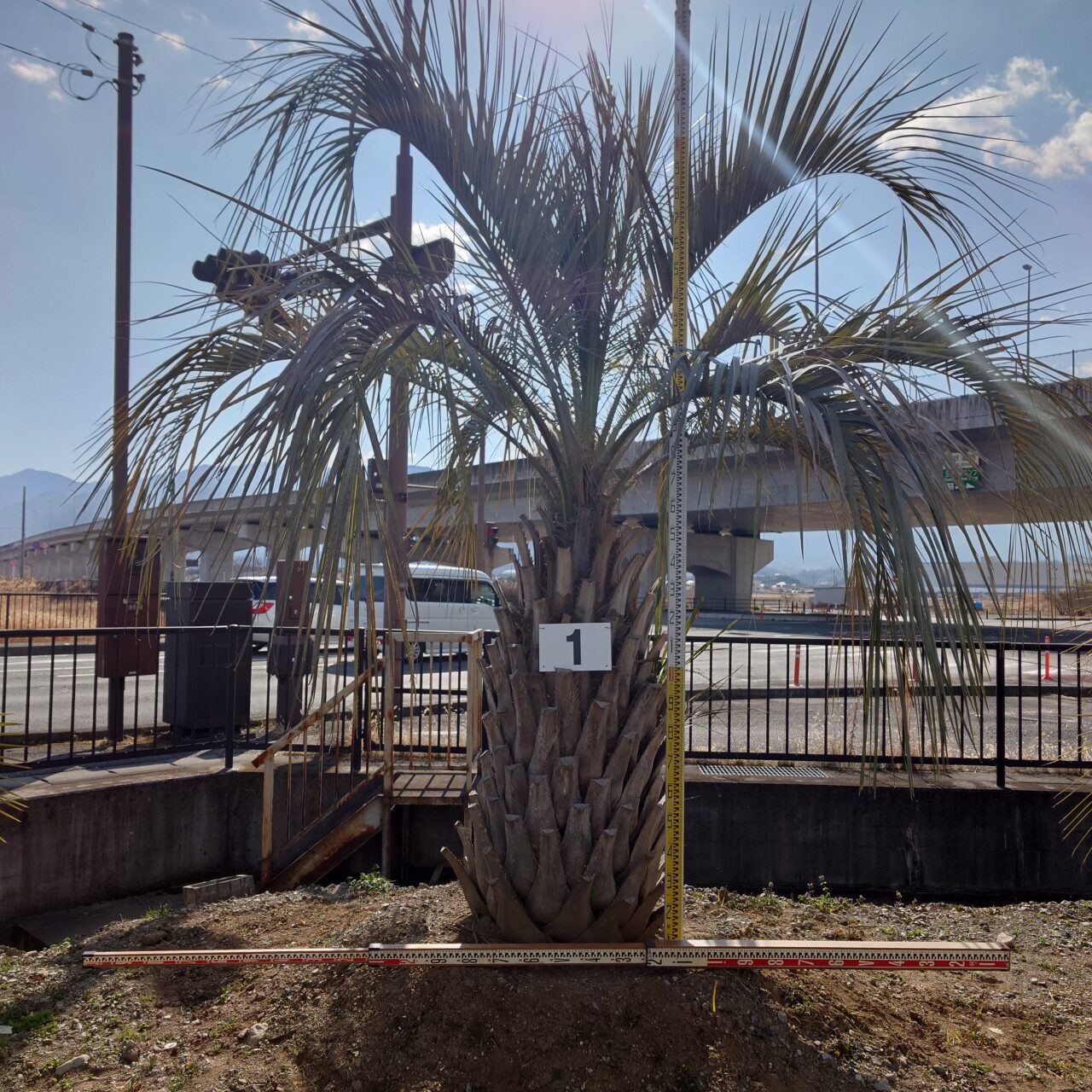 地面から高さ3.2m程度。(根鉢含む)葉の広がり3.8m程度。